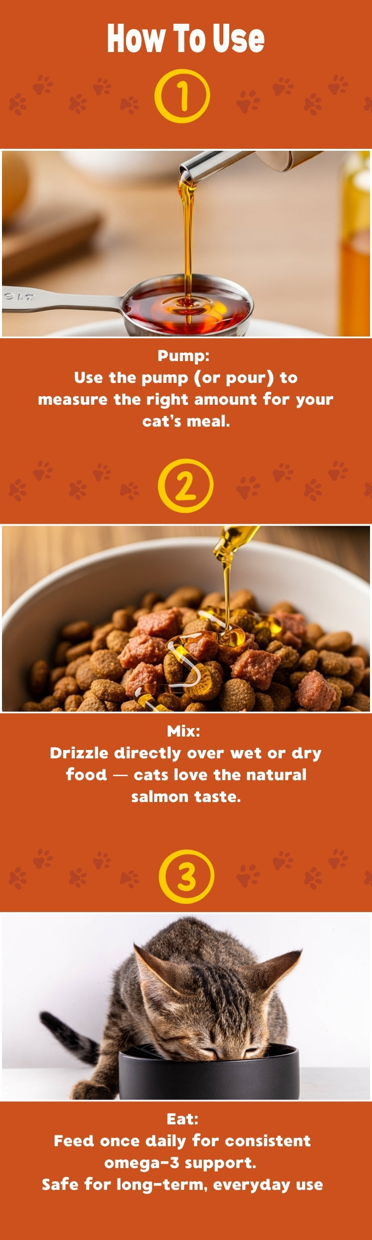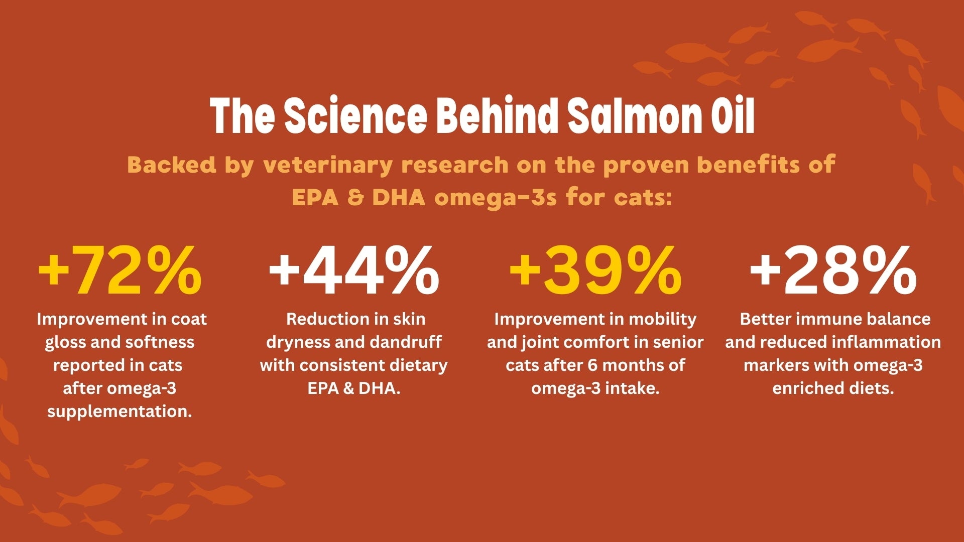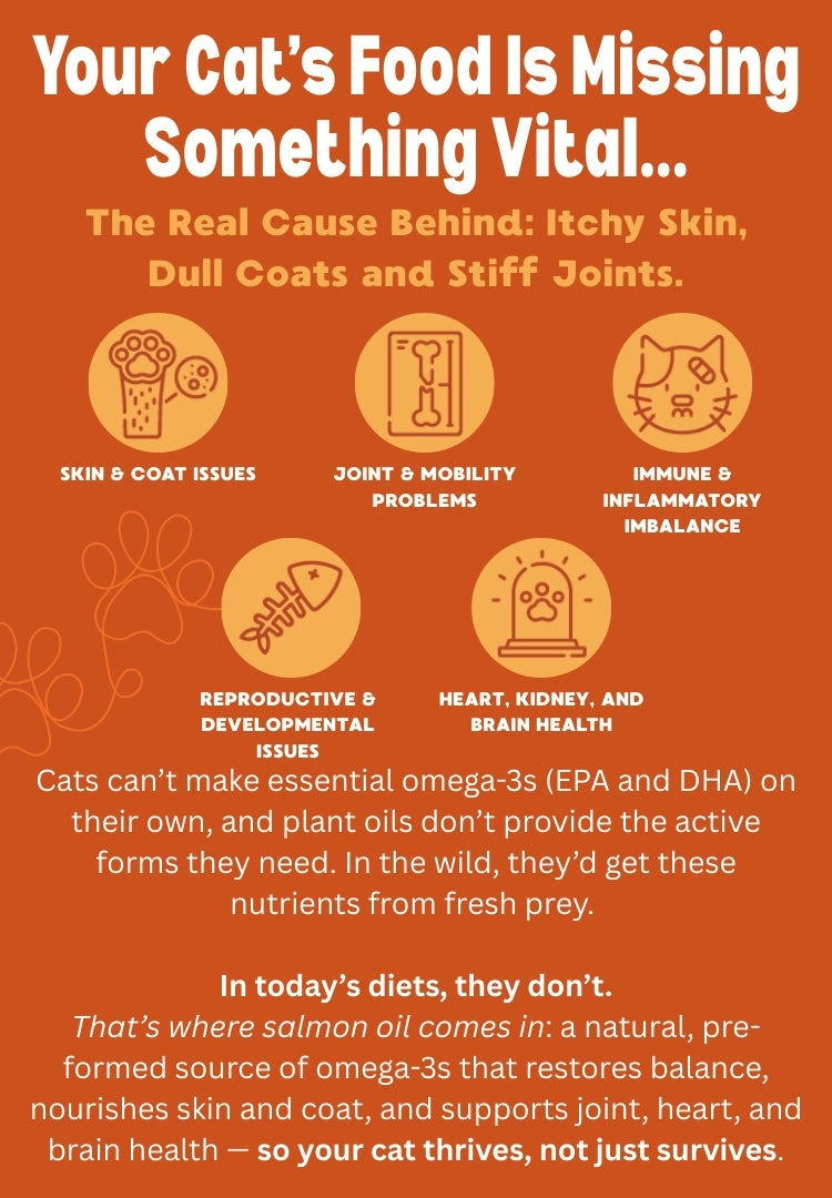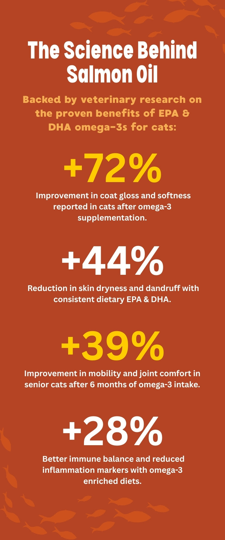 Salmon oil is a natural supplement extracted mostly from Atlantic or Pacific salmon and is rich in omega-3 fatty acids (EPA and DHA). These essential fats support healthy skin, a shiny coat, joint mobility, heart function, and cognitive development in both cats and dogs.
