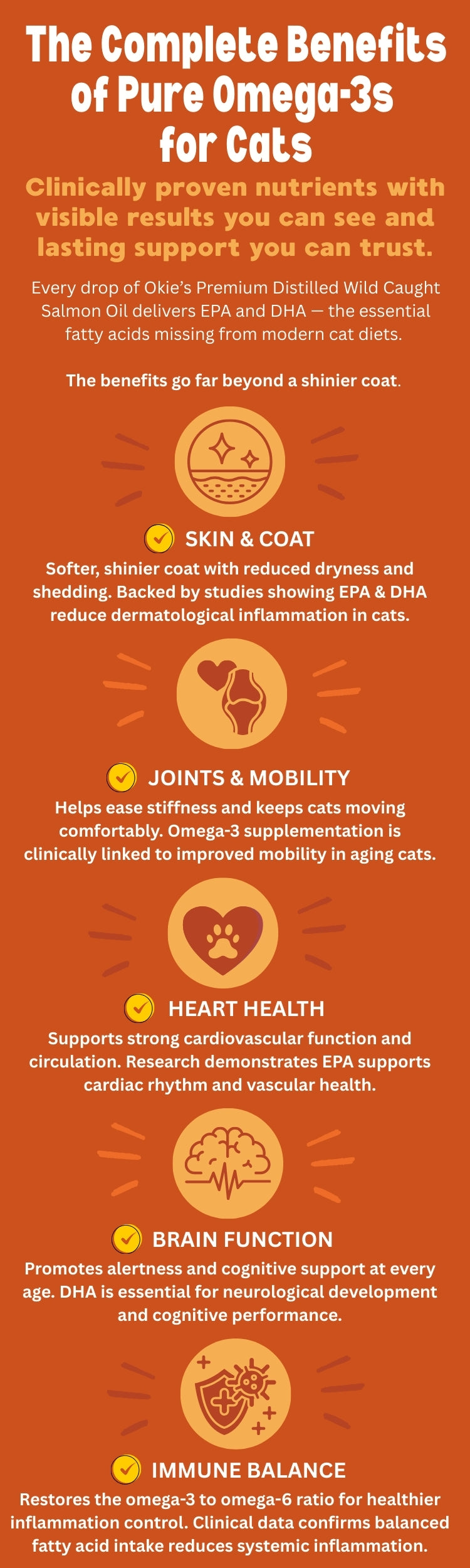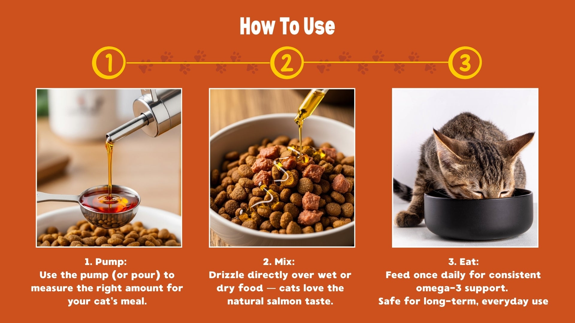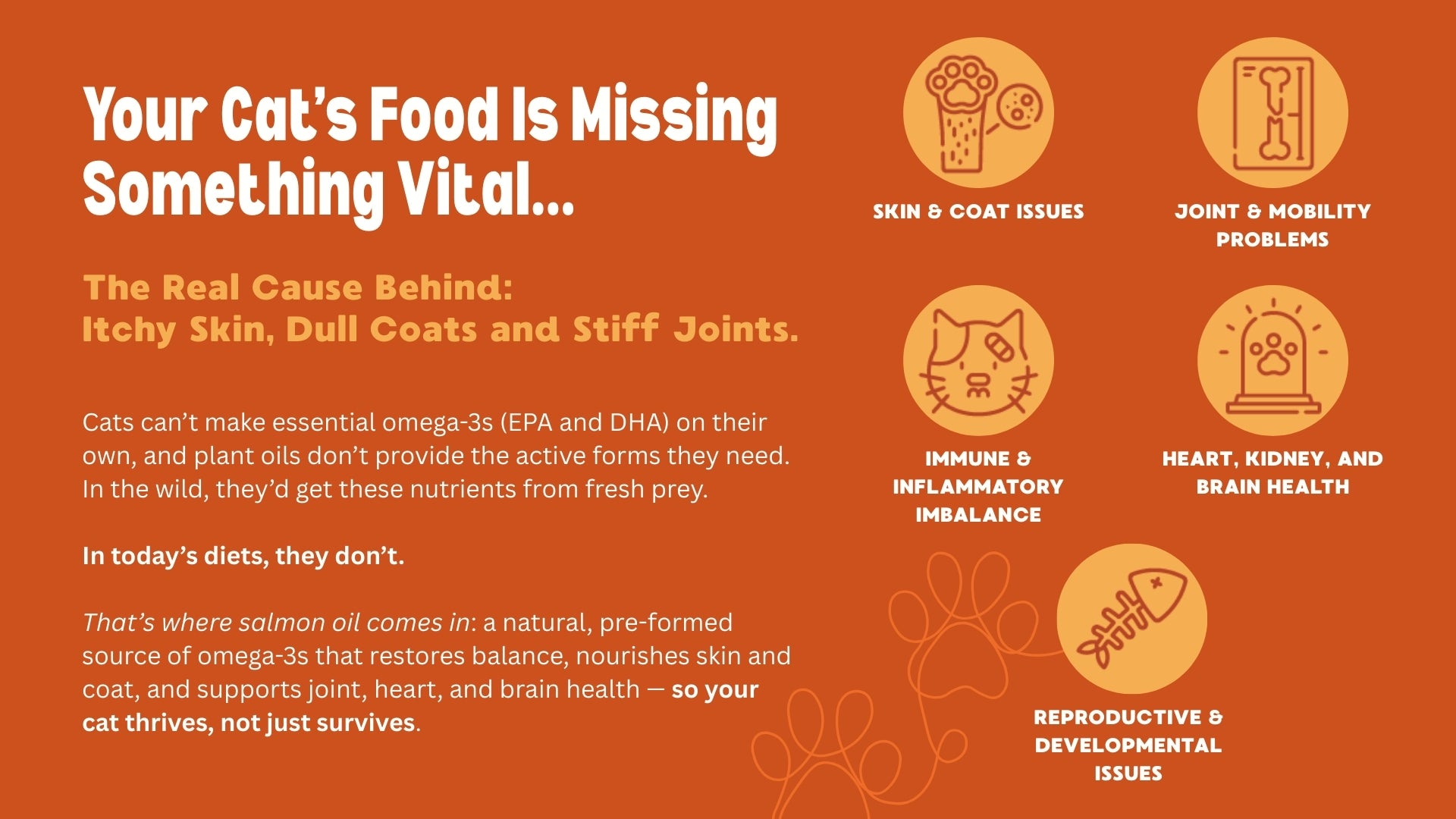 Salmon oil is a natural supplement extracted mostly from Atlantic or Pacific salmon and is rich in omega-3 fatty acids (EPA and DHA). These essential fats support healthy skin, a shiny coat, joint mobility, heart function, and cognitive development in both cats and dogs.