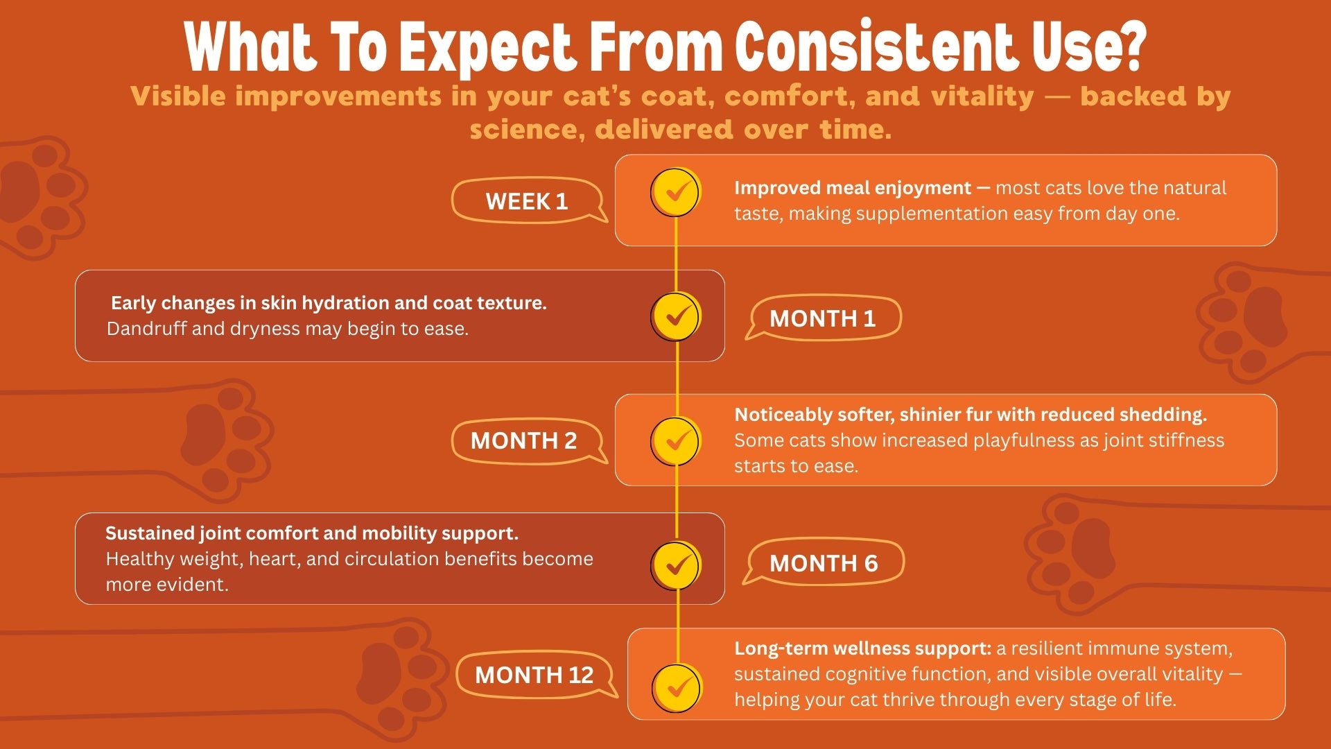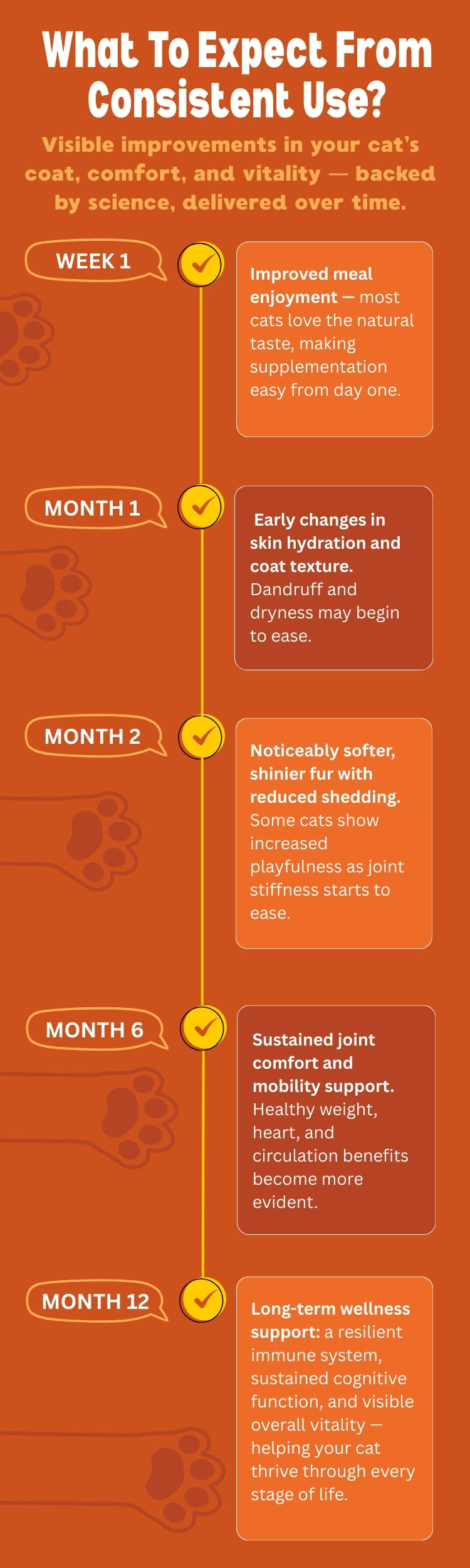 Improvements in coat shine, skin hydration, and reduced itching usually appear within 2–4 weeks. Benefits for joints, cognition, and immune health develop more gradually, over 1–2 months of consistent use.
